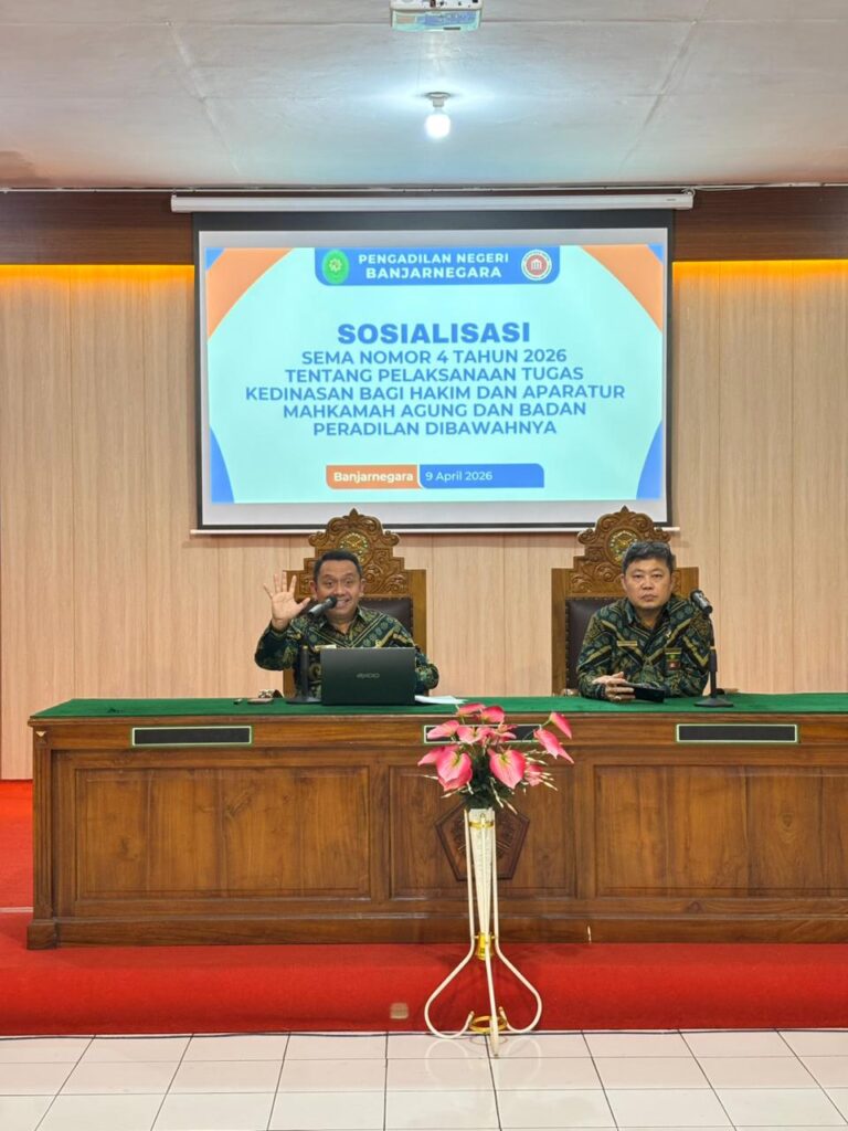 Banjarnegara – (09/04/2026): Pada Hari Kamis, 09 April 2026, bertempat di Aula PN Banjarnegara, telah dilaksanakan kegiatan Sosialisasi Surat Edaran Nomor 4 Tahun 2026 tentang Pelaksanaan Tugas Kedinasan Bagi Hakim dan Aparatur Mahkamah Agung dan Badan Peradilan yang Berada di Bawahnya dalam Rangka Mendukung Transformasi Budaya Kerja Nasional. Kegiatan ini disampaikan langsung oleh Ketua Pengadilan Negeri Banjarnegara, Bapak Anteng Supriyo, S.H., M.H., didampingi Wakil Ketua, Bapak Christian Wibowo, S.H., M.Hum.
