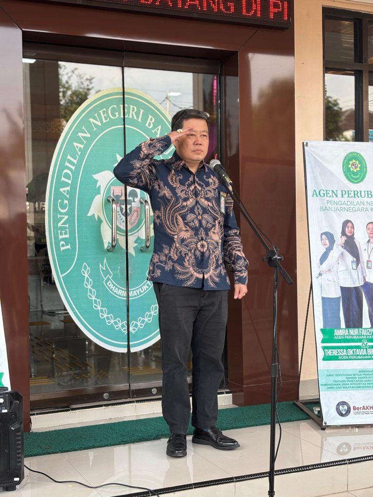 – Pembina apel mengucapkan terimakasih kepada seluruh hakim dan pegawai Pengadilan Negeri Banjarnegara atas kinerjanya selama satu pekan ini dan dihimbau untuk senantiasa menjaga kedisiplinan, integritas, juga kekompakan.
